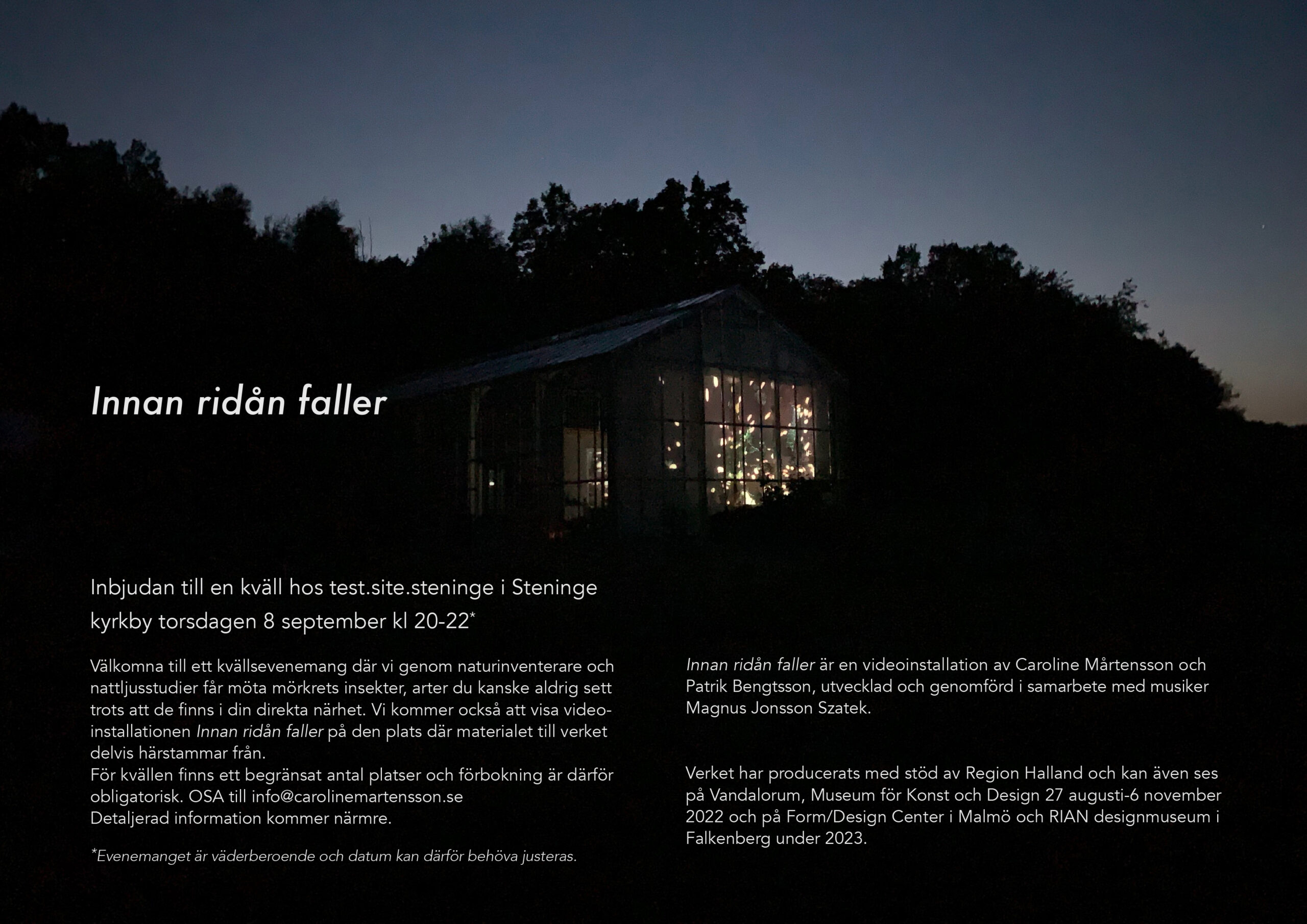 Innan ridån faller är en videoinstallation av Caroline Mårtensson och Patrik Bengtsson, utvecklad och genomförd i samarbete med musiker Magnus Jonsson Szatek. Verket kan även ses på Vandalorum, Museum för Konst och Design 27 augusti-6 november 2022 och på Form/Design Center i Malmö och på RIAN designmuseum i Falkenberg under 2023.