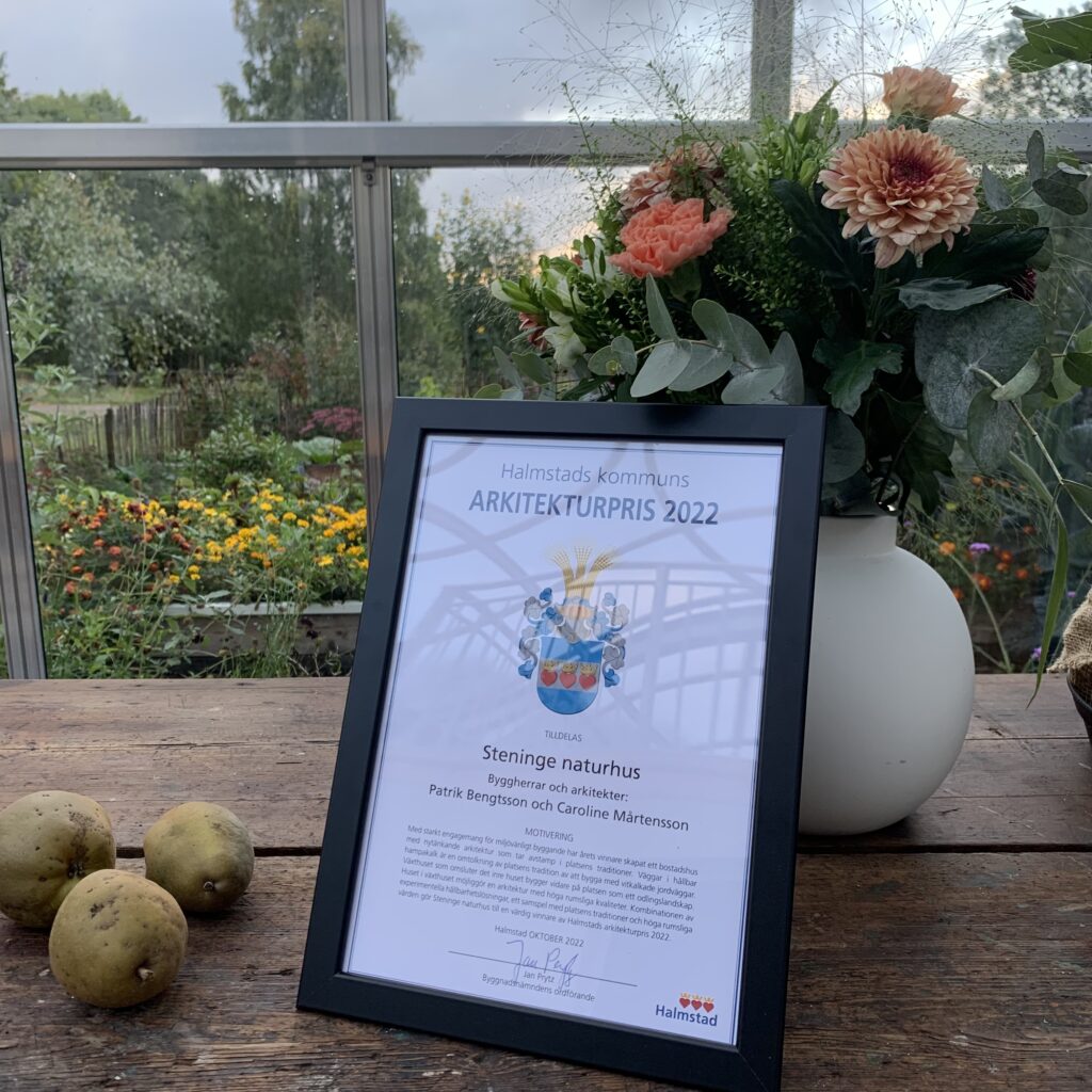 Vinnare av 2022 års arkitekturpris är Steninge Naturhus – ett bostadshus med väggar av hampakalk som byggts inuti ett växthus. Placeringen av huset i ett växthus gör att gränserna för vad som är inomhus och utomhus förskjuts samtidigt som annorlunda och intressanta rum skapas.